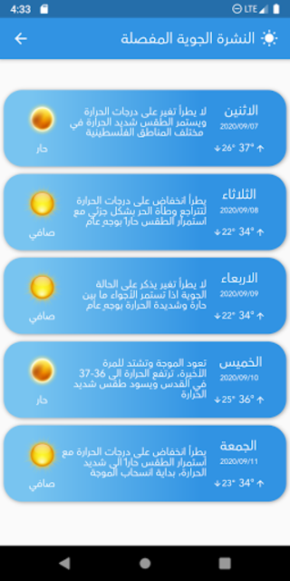 درجة الحرارة العظمى 40 درجة مئوية رياح شمال غرب بسرعة تتراوح من 15 إلى 30 كم/ساعة.